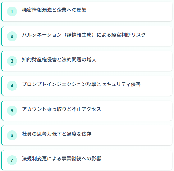 - 機密情報漏洩からハルシネーションまで、企業が直面する7つの具体的なリスク