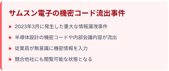 2023年3月、サムスン電子で深刻な機密情報流出事件が発生しました。同社の半導体部門(DS部門)の従業員が、ChatGPTにソースコードの最適化を依頼する際、実際の機密コードをそのまま入力したことが原因でした。