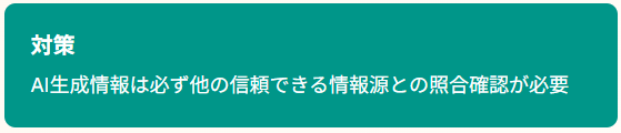 - 出力内容の他情報源との照合確認を必須化