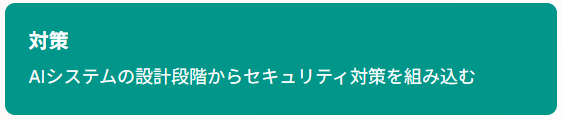 企業の顧客対応チャットボットがこの攻撃を受けた場合、顧客の個人情報や企業の内部システム情報が漏洩する深刻なリスクが存在します。このため、AIシステムの設計段階からセキュリティ対策を組み込むことが重要です。