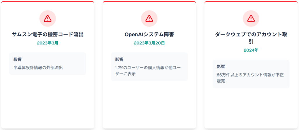 - サムスン電子やOpenAI障害など実際に発生したChatGPTセキュリティ事例の詳細