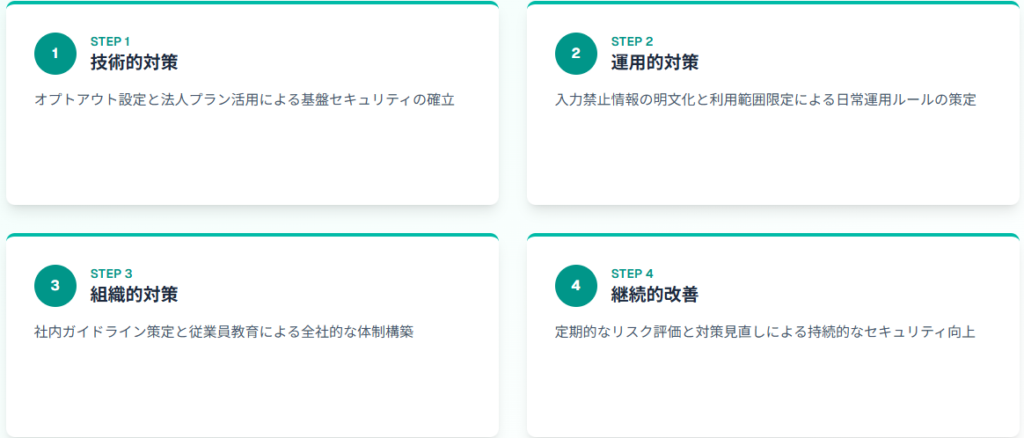 オプトアウト設定や法人プラン導入で基盤を固め、入力禁止情報の明確化と利用範囲の線引きで日常運用の安全性を担保します。