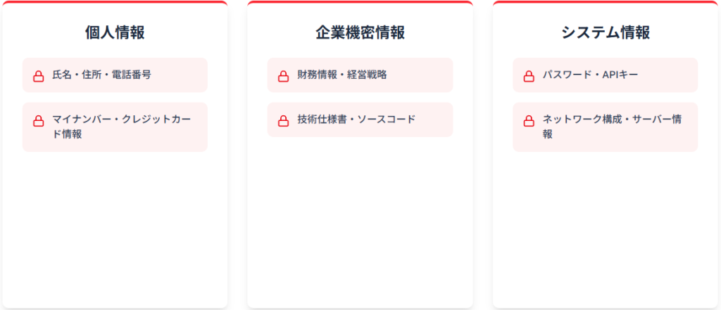 具体的な禁止項目として、氏名・住所・電話番号などの個人識別情報、契約内容や取引履歴、パスワードやAPIキー、ソースコードや設計図面などを明文化する必要があります。