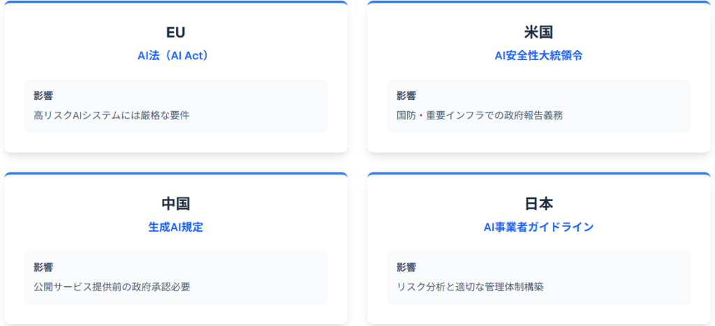 米国では、バイデン政権が2023年10月にAI安全性に関する大統領令を発令し、国防・重要インフラに関わるAI利用には政府への報告義務が課されています。中国では2023年8月に「生成AI規定」が施行され、公開サービス提供前の政府承認が必要となりました。