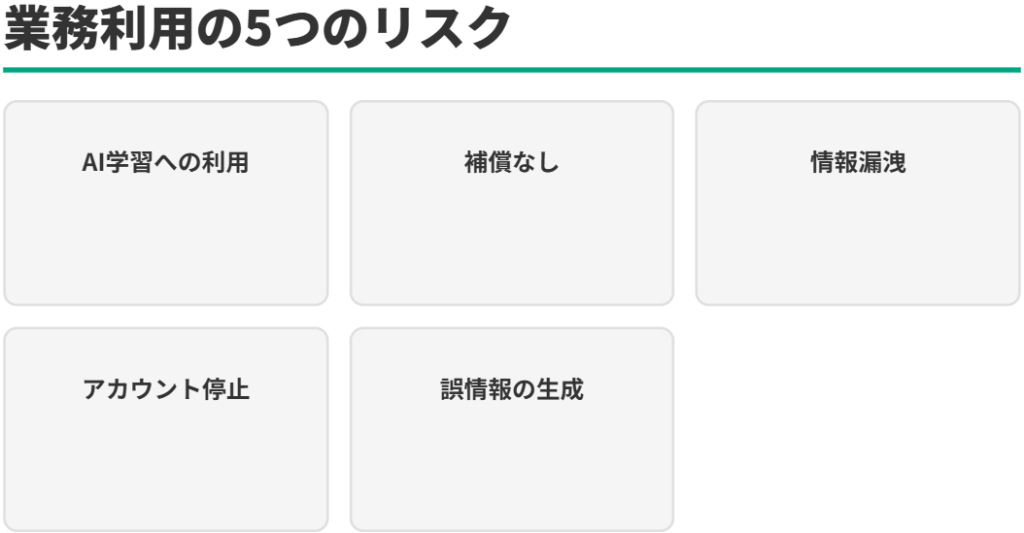 無償版やPro版を業務に投入する場合、データが学習利用され得る点や著作権面の補償が無いことは企業にとって重大な懸念となります。加えて、管理機能の不足により入力内容の追跡ができず、情報漏洩や統制不備のリスクが高まります。規約違反によるアカウント停止や誤情報生成の影響も無視できず、どれも事業継続に直結し得る問題です。