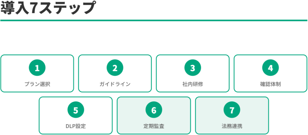 企業がCopilotを安全かつ効果的に商用利用するには、技術面とガバナンス面の両方からアプローチする必要があります。以下、実践的な7つのステップを紹介します。