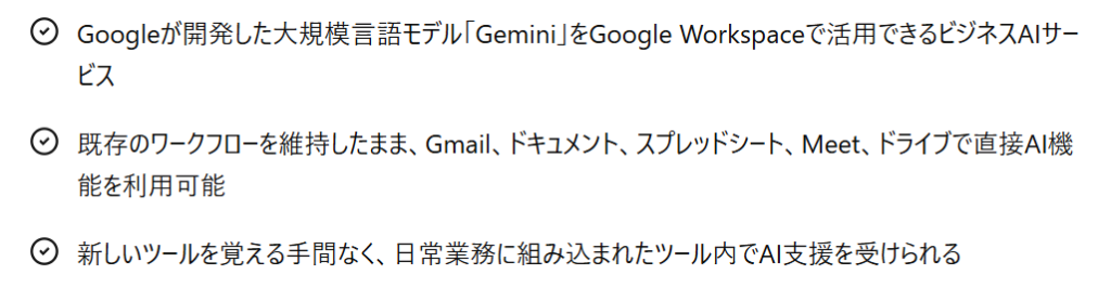 従来のAIツールと異なるのは、企業が日常的に使用するGmail、ドキュメント、スプレッドシート、Meet、ドライブなど、既に業務に組み込まれているツール内で直接AI機能を利用できる点です。新しいツールを覚える手間なく、既存のワークフローを維持したまま活用できます。