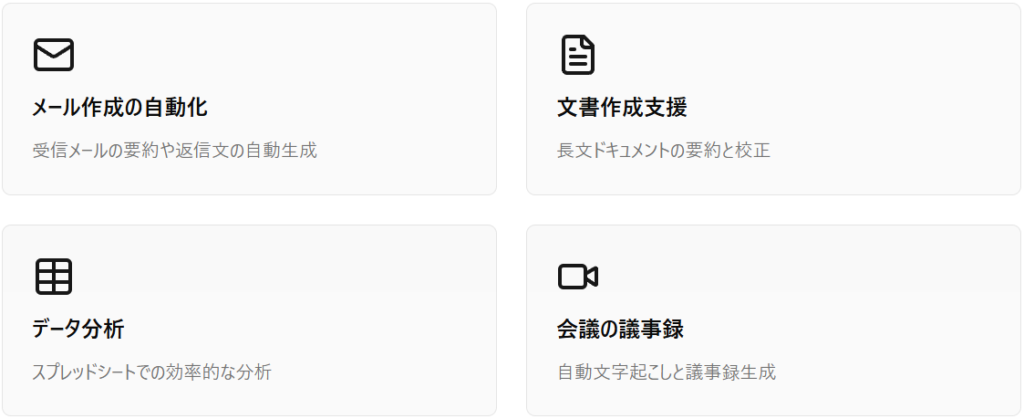では、具体的にどのような機能が使えるのでしょうか。メール作成の自動化、長文ドキュメントの要約、データ分析の効率化、プレゼンテーション資料の自動生成、オンライン会議の議事録作成など、業務のあらゆる場面でAI支援を受けられます。Gmailでは「Help me write」機能で受信メールの要約や返信文の自動生成、ドキュメントでは文章の校正や翻訳、スプレッドシートではデータ分析や関数の提案が可能です。