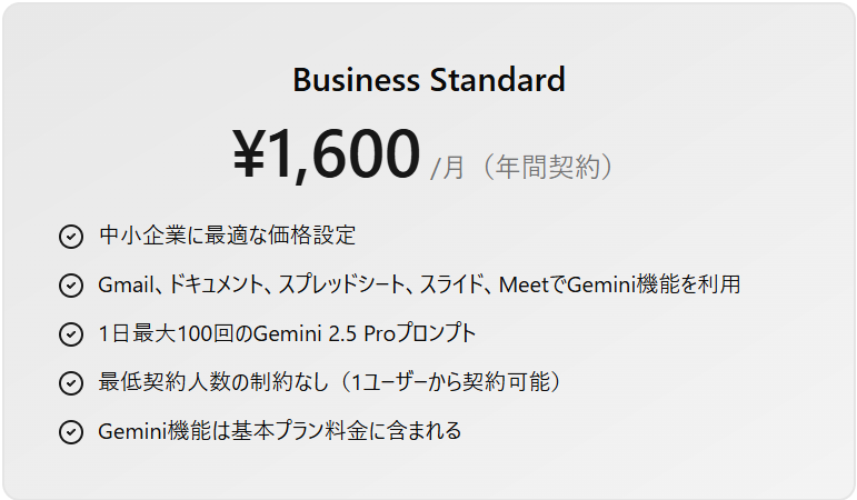 Business Standardプランは、1ユーザーあたり月額1,600円(年間契約の場合)で提供されており、中小企業に最適な価格設定です。Gmail、ドキュメント、スプレッドシート、スライド、Meetの全アプリでGemini機能を利用でき、1日最大100回のGemini 2.5 Proプロンプトが使えます。