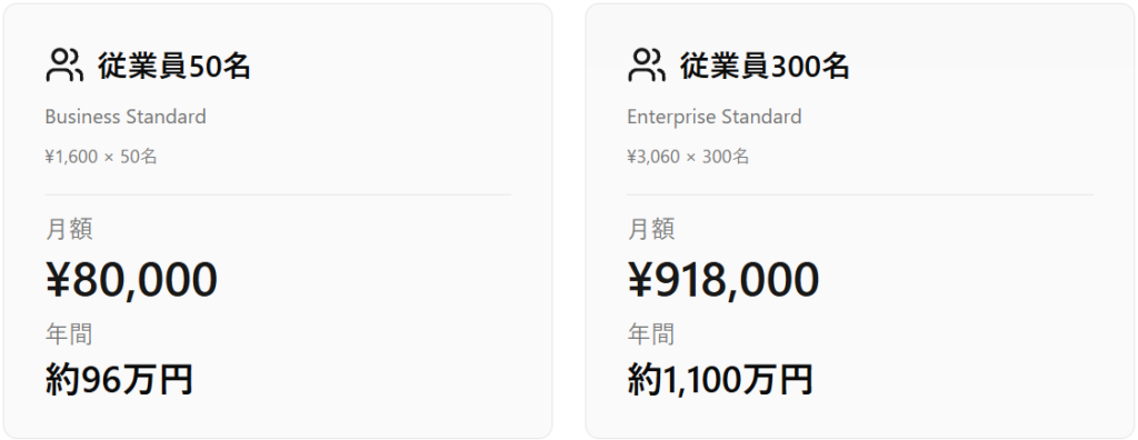 実際の導入費用はどれくらいになるのでしょうか。従業員50名の中小企業がBusiness Standardを導入する場合、月額1,600円×50名=80,000円、年間約96万円となります。従業員300名の中堅企業がEnterprise Standardを導入する場合、月額3,060円×300名=918,000円、年間約1,100万円となります。