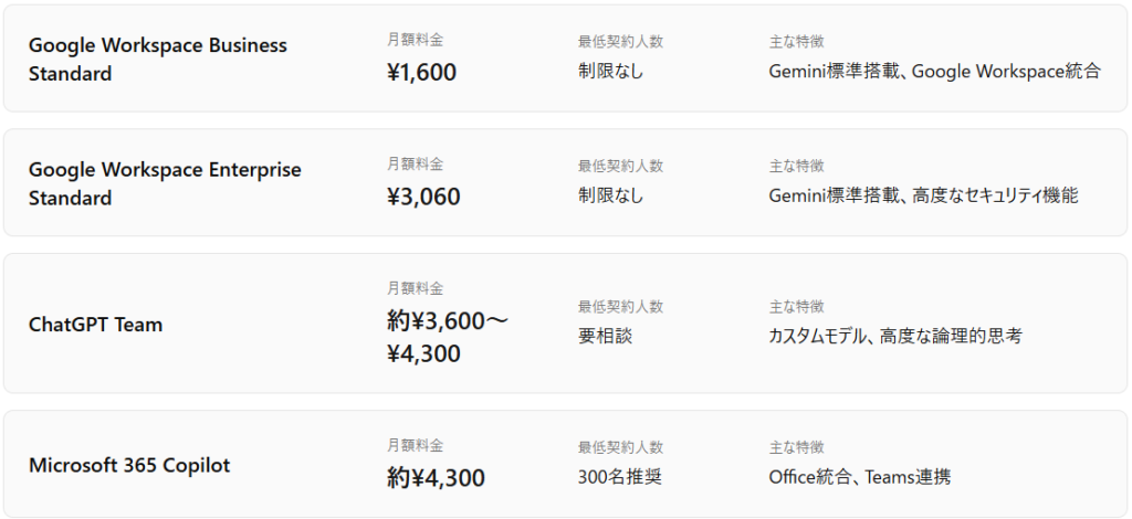 - ChatGPT Enterprise・Microsoft 365 Copilotとの徹底比較(料金・機能・適性の違い)と、Google Workspaceユーザーが選ぶべき理由