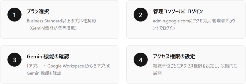 Google Workspace with Geminiを利用する手順は簡単です。2025年1月以降、Business Standard以上のプランではGemini機能が標準搭載されているため、新たにGoogle Workspaceプランを契約するか、既存プランを継続するだけで利用できます。