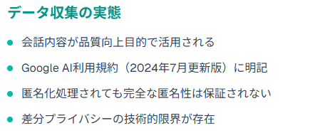 Gemini無料版では、利用者が入力した会話内容がGoogleのAIモデル改善のための学習データとして収集・活用される仕組みになっています。Google AI利用規約(2024年7月更新版)には、「会話内容を品質向上とサービス開発のために使用する場合がある」と記載されており、入力されたテキストデータが匿名化処理されても、企業の機密情報や個人情報が含まれる場合の完全な匿名性は保証できません。