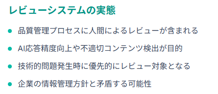 特に技術的問題や不適切な応答が発生した場合、該当する会話ログが優先的にレビュー対象となるリスクがあります。多くの導入現場で見られるのは、この人的レビューシステムが企業の情報管理方針と矛盾する可能性への懸念です。
