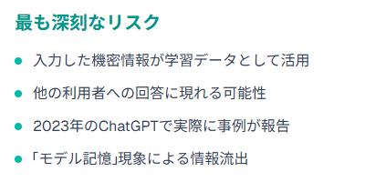 最も深刻なリスクは、入力した機密情報が学習データとして活用され、他の利用者への回答に現れる可能性です。