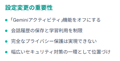 リスクを軽減するためには、Geminiのプライバシー設定を適切に管理することが重要になります。「Geminiアクティビティ」機能をオフにすることで、会話履歴の保存と学習利用を制限できますが、この設定変更だけでは完全なプライバシー保護は実現できません。