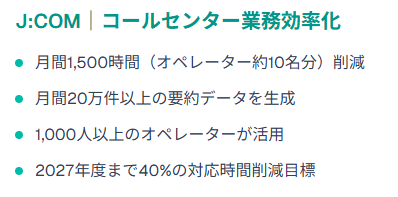 2024年7月からの本格運用により、1,000人以上のオペレーターが利用し、月間20万件以上の要約データを生成しています。通話履歴の要約業務を自動化することで、顧客対応の効率化を実現しました。2027年度までに顧客1人あたりの問い合わせ対応時間40%削減を目標としています。