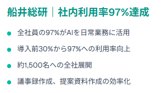 株式会社船井総合研究所では、Google Workspace版Geminiの導入により全社員の97%がAIを日常業務に活用する体制を構築しました。国内グループ全社員約1,500名への展開により、導入前の生成AI利用率30%から97%まで向上を達成しています。