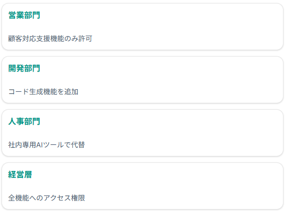 部署の業務特性に応じたアクセス権限設定により、必要最小限の権限付与原則を実現できます。営業部門には顧客対応支援機能のみを許可し、開発部門にはコード生成機能を追加するといった具体的な権限設計を行います。