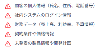 分類基準を従業員が理解しやすい具体例で示すことで、現場での判断迷いを減らします。この分類システムにより、AIの利便性を活用しながら適切な情報管理体制を構築できます。