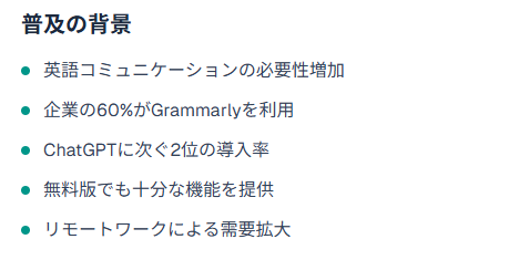 無料版でも十分な機能を提供しているため、個人が使い始めてから企業内に広がるケースが目立ちます。リモートワークの普及により、英文メールや資料作成の機会も増え、需要はさらに高まっています。
