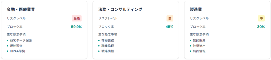 金融業界では顧客データや取引情報の機密性が極めて高く、Zscaler調査では金融/保険業界がAI/MLトラフィック全体の28.4%を占める一方、組織のAI利用ブロック率が59.9%に達しており、厳格な管理が行われています。