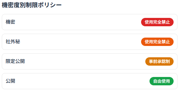 効果的なリスク管理のためには、企業内文書を機密度別に分類することが前提となります。「機密」「社外秘」「限定公開」「公開」の4段階に分類し、各レベルに応じてAIツールの使用ルールを設定します。