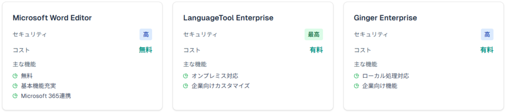 既存のMicrosoft 365環境と統合することで、外部データ送信を回避しつつ運用負担を最小化できます。一方、LanguageToolのオンプレミス版のような専用ツールは、投資コストは発生しますがセキュリティ面で高い信頼性を提供します。企業規模や用途に応じた比較検討を行い、統制の取れた仕組みを構築することが望ましいでしょう。