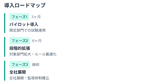 問題がなければ対象部門を段階的に拡大し、最終的に全社展開を目指します。各段階で詳細なリスク評価を実施し、必要に応じて運用ルールの見直しを行います。