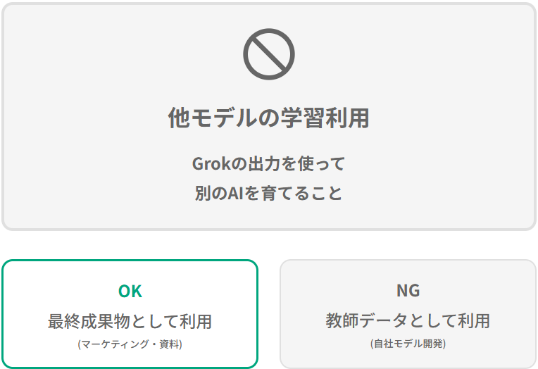 コミュニティライセンスでは、Grokの出力を別の生成AIや機械学習モデルの学習データとして利用することが禁止されています。たとえば、Grokで大量に画像を生成し、それを自社独自モデルのトレーニング画像として使うと、ライセンス違反に該当します。