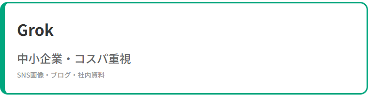 Grokはブログ用ビジュアルや社内資料のような抽象系コンテンツでは効果的で、制作効率を大幅に高めつつリスクも抑えやすいのが特徴です。
