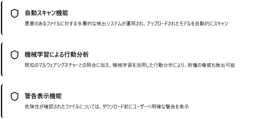 Pickleファイル特有のリスクに対応するため、MicrosoftとのCollaborationによるオープンソースのモデルスキャナー「Picklescan」を実装しています。このツールはPythonオブジェクトのシリアル化ファイルを精査し、任意コード実行の可能性があるPickleファイルを事前に識別します。