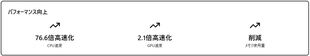 - CPUでは76.6倍、GPUでは2.1倍の高速化を実現