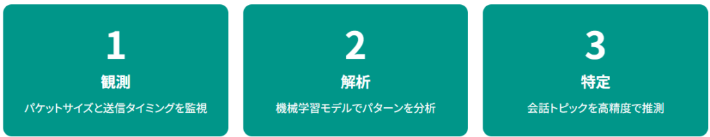 TLS暗号化で保護された通信であっても、パケットサイズや送信タイミングといったメタデータから会話トピックが推測され、企業の機密情報や戦略的な意思決定内容が競合他社に筒抜けになる可能性があります。