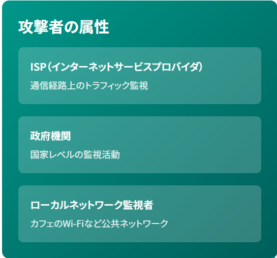 攻撃を実行できるのは、暗号化トラフィックを観測できる立場にある攻撃者に限定されます。インターネットサービスプロバイダ(ISP)や政府機関、カフェのWi-Fiのようなローカルネットワークの監視者が該当します。