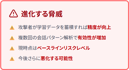 研究チームは、現時点の結果がリスクの初期水準を示すものであり、攻撃者が学習データを蓄積すれば精度が向上する可能性があると指摘しています。複数回にわたる会話や同一ユーザーの通信パターンを解析することで、攻撃の有効性が増すことも確認されています。