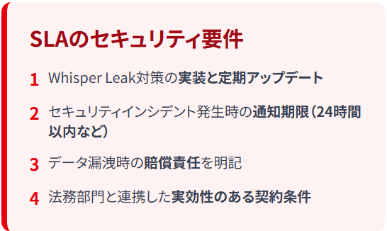 ベンダーとのSLAにセキュリティ要件を明記することで、対策の実装状況やインシデント発生時の対応責任を明確化できます。「Whisper Leak対策の実装と定期的なアップデート」「セキュリティインシデント発生時の通知期限(24時間以内など)」「データ漏洩時の賠償責任」などを契約に含めることで、法的保護を強化します。