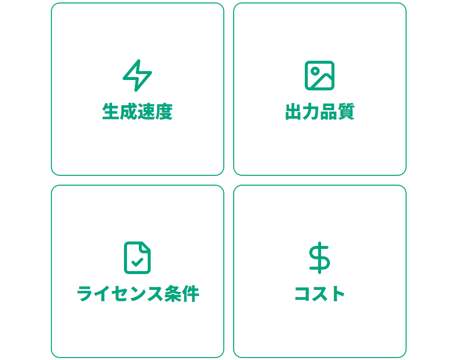 生成速度、出力品質、ライセンス条件、コストの4軸で評価します。短尺SNS広告やUGC向けにはPika 2.1/Turboの高速生成が適し、製品解説動画やモーショングラフィックスにはLuma Dream Machineのビジュアルアノテーション機能が有用です。