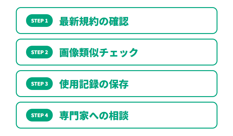 - 生成した画像とその使用記録を社内で適切に保管し、規約変更後も既存の利用が認められるよう証跡を残す