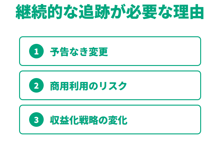 特に無料AIツールは、サービスの収益化戦略や法的環境の変化に応じて、規約が頻繁に見直される傾向があります。