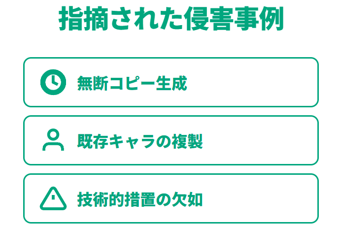 争点は既存キャラクターに酷似する出力や権利保護の仕組みが十分かといった点に置かれています。