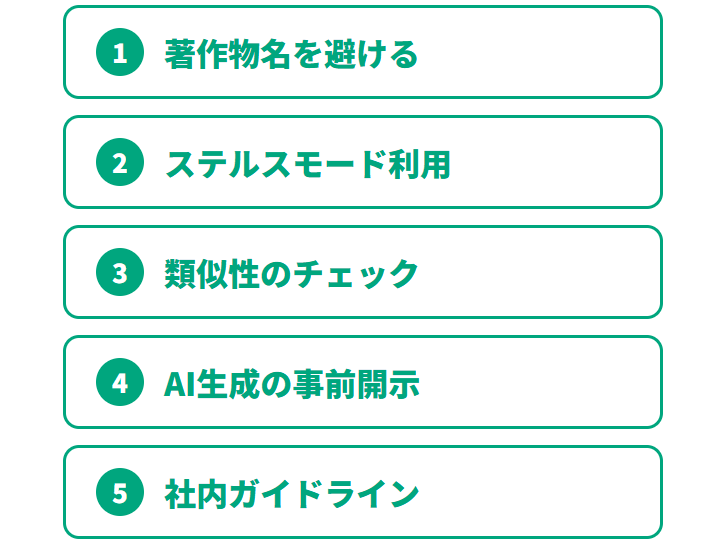 Midjourneyを法人で商用利用する際は、著作権侵害リスクを最小限に抑えるための具体的な対策が欠かせません。以下の5つのポイントを実践することで、安全性を高められます。