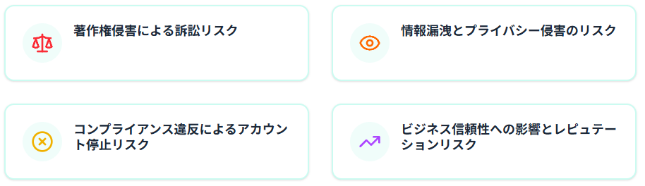 企業のMidjourney導入で発生するトラブルは、法的問題から運営面のリスクまで幅広い分野に及んでいます。これらの危険性を甘く見て導入を進めると、想定外の大きな損失を被ってしまうケースが後を絶ちません。