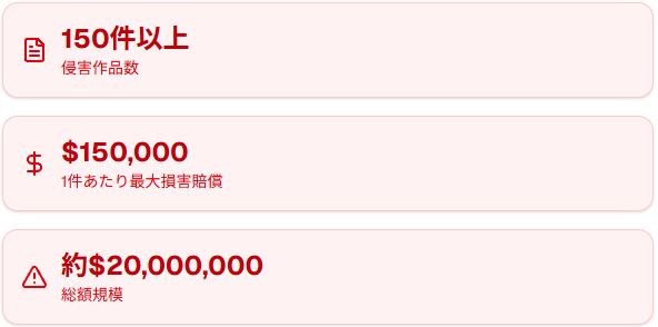 2025年の集団訴訟では、著作権侵害による損害賠償として150件以上の作品に対し1件最大15万ドル、総額最大約2000万ドル規模の請求が行われています。