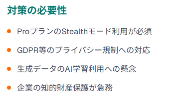 この機能はProプラン以上の契約者のみが利用でき、BasicやStandardプランでは一切使用できません。ステルスモードを使わずに業務利用した場合、社内の極秘プロジェクトや顧客に関する機密情報を含むプロンプトが第三者に閲覧され、情報漏洩による損害は計り知れない規模に膨らみます。