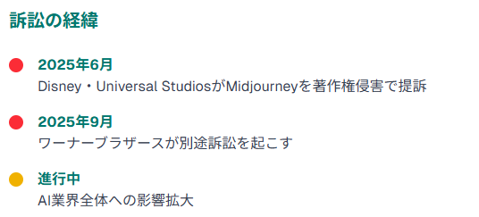 2025年6月、エンターテインメント業界の大手であるDisney・Universal StudiosがMidjourneyを著作権侵害で提訴し、9月にはワーナーブラザースも別途訴訟を起こしました。