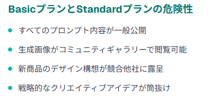 Midjourneyの基本プランでは、入力したプロンプトと生成画像がコミュニティに公開され、企業の機密情報や戦略的アイデアが第三者に漏洩してしまいます。ProプランのStealthモード利用により回避可能ですが、基本プランでの情報漏洩は企業にとって深刻な損失につながる危険性があります。