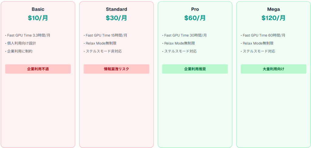 特に年間売上100万ドルを超える企業は、Midjourneyの利用規約によりProプラン以上の契約が必須となっており、企業でMidjourneyを導入する際は、必ずPro以上のプランを選択し、全社員にステルスモードの徹底使用を義務づけることが重要です。