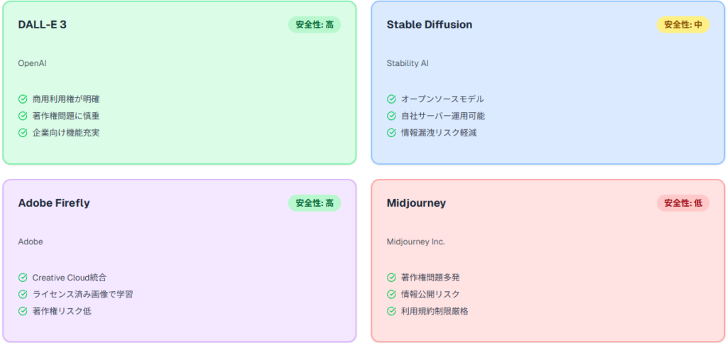主要な画像生成AIサービスには、それぞれ異なる特徴と安全性レベルがあります。