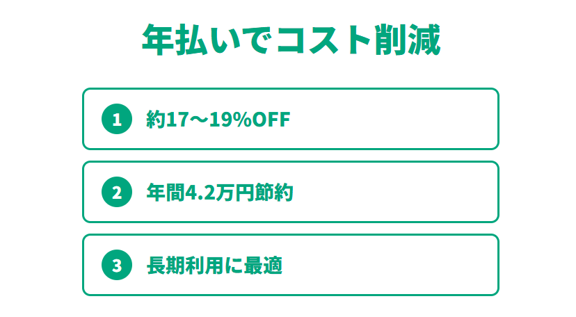 年払いを選択すると、月払いと比較して17〜19%の割引が適用され、大幅なコスト削減につながります。プラスプランを10名で利用する場合、月払いでは年間24万円(2,000円×10名×12ヶ月)かかりますが、年払いでは年間19.8万円(1,650円×10名×12ヶ月)となり、年間4.2万円の節約になります。